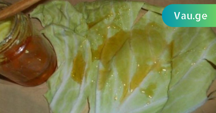 აუცილებლად ვიღებ კომბოსტოს ფოთოლს, 1-2 წუთის განმავლობაში ადუღებულ წყალში ვაჩერებ.შემდეგ ვასხამ თაფლს და მკერდზე ვადებ ავადმყოფს (ძლიერი ხველების დროს – ორი კომბოსტოს ფოთოლი გამოიყენეთ, ერთი მკერდზე, მეორე ზურგზე).