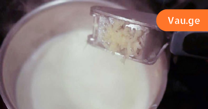 ქვაბში დაამატეთ რძე და წყალი, დაამატეთ ნიორი და გაათბეთ ეს ინგრედიენტები.
