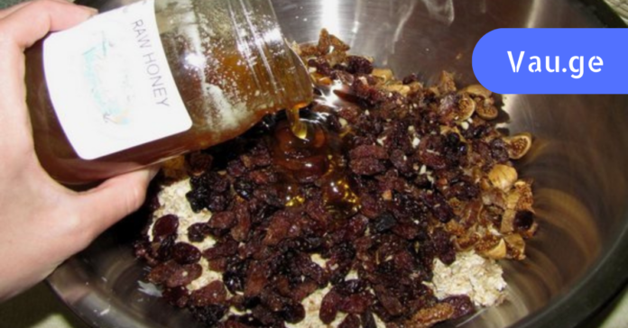 - შეურიეთ წვრილად დაჭრილი ნუშის გული, ქიშმიში და დაასხით 1,5 ჩ/ჭ ახალი თაფლი.